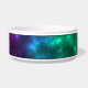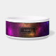 Abstract and colourful space cosmos / outer space nebula background with white dots as stars. The top and bottom have a thin black border. The design features colours such as blue, pink, green and orange.There is also a personalizable text area for the name of the pet.