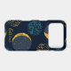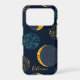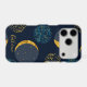 Fun abstract pattern of moon and stars on a dark blue background with printed gold foil accents.