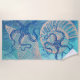 Save your spot in the sand with this lovely beach towel featuring an artsy abstract design in beautiful shades of blue and teal with accents of beige on sea life and seashells.