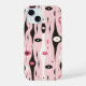 This artwork features an abstract pattern of elongated, droplet-like shapes in varying shades of pink, black, and white. The fluid forms stretch vertically across the canvas, creating a sense of motion and flow. The design includes a mix of soft curves and sharp edges, with some shapes resembling eyes or organic forms. The contrasting colours and the rhythmic repetition of the elements give the composition a dynamic and almost hypnotic quality. The overall effect is both playful and surreal, blending organic and abstract motifs.