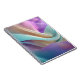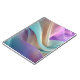 A close-up of flowing fabric in pastel colours. The fabric is draped and folded, creating soft waves and curves. The colours transition smoothly from light blue and teal to lavender, pink, and pale yellow. The texture of the fabric appears smooth and delicate, with subtle highlights and shadows enhancing the three-dimensional effect.