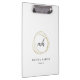 Chic clipboard features your initial(s) or monogram in calligraphy script inside a faux gold foil abstract circle element on a crisp white background. Personalise with two lines of custom text beneath. Design repeats on reverse side.