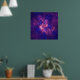 Poster abstract blue and purple digital composition, original and bold combination of colours and shapes. The pink shapes that give a pattern in the design remind of small natural flowers and mix with small light, vivid blue sparkles pattern, that also might look like little flowers, so it looks like purple and intense blue are paired to create an extra-terrestrial tapestry. Overall, the algorithmic yet at the same time aleatory repetition of certain patterns, remind that the design is actually a fractal. The colour palette is quite original and unique, mixing almost all shades of purple with all shades of blue, the bright light in the middle and the dark on the border.