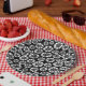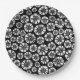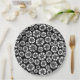 A hand drawn abstract floral pattern made up of scattered and varied circular discs with ray like breaks to divide the petals and with with spotted centres.