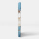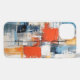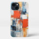 An abstract painting featuring a grid-like composition of overlapping and interlocking rectangular and square shapes. The palette is a mix of muted and bold colours, including shades of blue, beige, and white, punctuated by two prominent blocks of vibrant orange. The brushstrokes are thick and textural, giving the impression of an impasto technique. Thin black lines add structure and a linear element to the chaotic layers of colour.