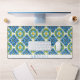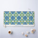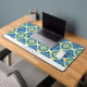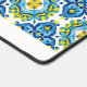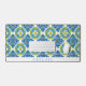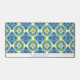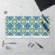 Abstract geometric Mediterranean blue and yellow tile pattern desk mat. This desk mat showcases a captivating abstract geometric pattern of Mediterranean blue and yellow tiles, creating a vibrant and inspiring workspace. The intricate design, rendered with a watercolor effect, brings an artistic touch to your desk, serving as both a functional surface and a beautiful focal point. Not only does it protect your desk, but it also adds a touch of personality. A clean white band along the bottom provides an opportunity for personalisation, allowing you to add your name or a favourite quote. This desk mat offers the perfect blend of practicality and artistic flair, elevating your everyday work experience.