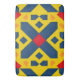 A vivid abstract geometric design featuring vibrant yellow, blue, and red tones forming a symmetrical pattern. Perfect for artistic backgrounds, decorative projects, and graphic design inspirations.