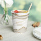 This wedding design set, with it's abstract pattern of flowing ripples and veins of glittering gold, brings to mind eye-catching rock formations and sparkling gems. The neutral colour palette in shades from champagne to soapstone adds to the appeal. The coordinating paper cup shown here has an abstract background holding optional text of 'Cheers to the happy couple' along with your names and wedding date. Search ID903 to see other colour choices and coordinating pieces for this unique wedding collection.