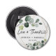 Gold geometric abstract with watercolor eucalyptus leaves bottle opener with love & thanks, name and date. Perfect idea for wedding favours or gifts for guests for any occasion.