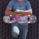 A wonderful messy, grungy mix of paint strokes, splatters and marks in a colourful palette of purple, pink, blue, green, yellow, black and white. Personalise with an initial.