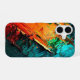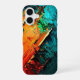A dynamic and highly textural abstract piece that combines vibrant, splattered paint with sharp, linear forms. The composition is divided by a diagonal line, with one side dominated by bright orange, red, and yellow, and the other by a deep turquoise and teal. The textures appear to be created with thick, rough brushstrokes or a palette knife, giving the painting a fragmented, shattered look. The sharp lines suggest rapid, kinetic energy.