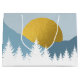 A beautiful design showcasing a forest covered in snow, mountain landscape and a golden sunset or sunrise reflecting in the water. Colour tones include neutral tones such as blue, white and gold. A rustic design ideal for Winter home decor and the festive holiday season.