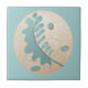 A simple leaf in turquoise and gold on a parchment background. Design leans towards the abstract.