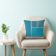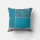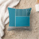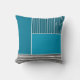 This throw pillow has a geometric design of a large teal rectangle in the upper left corner, darker teal stripes in the upper right corner, a lighter smaller teal rectangle below the stripes, and black lines across the bottom. If you like the design but prefer different colours, message me.