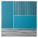 This tile has a geometric design of a large teal rectangle in the upper left corner, darker teal stripes in the upper right corner, a lighter smaller teal rectangle below the stripes, and black lines across the bottom. If you like the design but prefer different colours, message me.