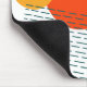 This mouse pad has a mid-century modern design of curvy and zigzag lines in black, circles in yellow, orange, and green, and a rectangle made from dashed teal lines. If you want the same design with different colours, message me.