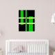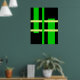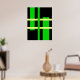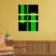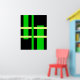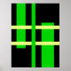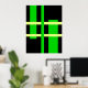 A minimalist modern abstract geometric art design of lines and blocks in green and yellow colours on a black background.