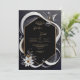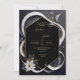 This image features an abstract and sophisticated design. The design showcases a black hexagonal frame outlined in gold, set against a dark background. Flowing white and grey ribbon-like elements gracefully encircle the frame, creating a sense of movement and elegance. The design is accented with delicate gold details and small, stylised leaves in muted tones. At the bottom left corner, a large, white flower with a gold centre adds a touch of organic beauty to the composition. The overall aesthetic is modern and refined, with a monochromatic colour scheme that is complemented by subtle gold accents. This design would be perfect for a chic and contemporary wedding, particularly one that embraces a minimalist or black-tie theme. Personalise the text regarding the names and details of the wedding. You can download the card to your mobile device or computer.