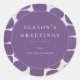 Abstract modish shapes, personalised holiday sticker. Festive shades of purple and faux gold shapes with template text lines for your holiday greeting and name.