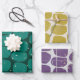 Abstract modish shapes, holiday wrapping paper sheets. Festive shades of green, purple, yellow and faux gold shapes and dust.