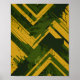 This design features a bold abstract composition with a deep green background and dynamic mustard-yellow elements. Thick angular lines and arrows stretch diagonally across the surface, creating a strong sense of movement and direction. Paint splatters and rough textures add a raw, expressive touch that contrasts with the structured geometry of the layout. The interplay between mustard yellow and dark green gives the design both warmth and intensity, evoking motion, strength, and industrial energy.