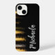 Photo of sparkly glistening night lights sea reflection in black and gold shiny colours.