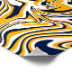 This abstract design features a dynamic interplay of flowing, wavy lines that create a sense of movement and fluidity. The dominant warm orange brings energy and vibrancy to the composition, while the deep navy blue provides a striking contrast. White accents help balance the colours, adding clarity and definition to the intricate patterns.
