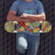 Vibrant geometric patterns fill the image, featuring circles, triangles, and swirls in a kaleidoscope of colours including blue, green, yellow, and red. The intricate design creates a sense of symmetry and balance.