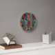 This wall clock has an art deco design of ovals with abstract designs within each in retro colours of pink and blue.