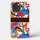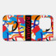 Colourful, painted shapes and lines in red, blue, orange, and gold, on a white background creates a brilliant phone case. Personalise with your name in red on a black band.