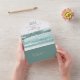 A paint strokes watercolor, in sparkling shades of sea glass green with splashes of soft blush pink, accents the pieces of this beautiful wedding suite. The all-in-one wedding invitation and RSVP shown here also features elegant handwritten calligraphy and a template to easily add your own names and event details. Search ID886 to see other pieces and colour choices for this set.