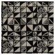An original hand drawn continuous pattern made up of an irregular grid of squares each divided diagonally in random ways creating triangles some shaded, some unshaded with some further decorated.