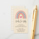 This cute rainbow baby shower enclosure card offers a request for guests to bring a book for the baby. The abstract rainbow graphic appears in girly colours of light pink, teal, dark pink and gold and is accented with a pink heart.