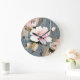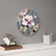 A watercolor of a light blush flower on a blue-grey and pink background with white streaks like rain creates a beautiful and romantic wall clock.