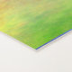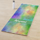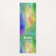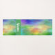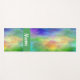 Custom yoga mat done in a colourful yellow, green, blue and pink plasma cloud design, with a green band, across one end, with custom white text. Same design is featured on both the front and backside of the mat.