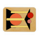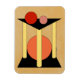 In this abstract artwork, an orange circle sits between three yellow pillars standing on a square or rectangular base, while a red and soft red circle sit upon a triangular platform atop the pillars.