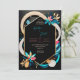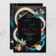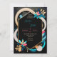 This image features a vibrant and modern abstract design, suitable for a wedding invitation or a similar event. The design centres around a black hexagonal frame with a gold outline, set against a dark background. Surrounding the frame are bold, flowing shapes in colours like teal, pink, beige, and dark blue, adding a dynamic and lively touch to the composition. The use of geometric floral elements in contrasting colours enhances the visual appeal, making this design feel fresh and contemporary. The arrangement of colours and shapes creates a sense of balance and harmony, while the hexagonal frame provides a structured focal point for any text or details that might be added. Overall, this design exudes a sense of modern elegance and playful sophistication, making it perfect for a wedding that embraces a colourful, contemporary theme. Personalise the text regarding the names and details of the wedding. You can download the card to your mobile device or computer.