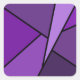 Inspired by stained glass, this stylish geometric design contains polygons in various shades of purple outlined in black. A lavender triangle slashes in from the upper right with an array of progressively darker purple quadrangles and other shapes spiralling around it from light to dark. Two dark purple shapes ground the left side of the original design.