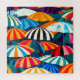 A cheerful depiction of sun-soaked days and seaside relaxation with colourful striped beach umbrellas.