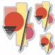 A black triangle divided into segments, a black trapezoidal band divided into two, a red circle, a yellow rectangle, a pale red square, a purplish circle, and an orange square feature in this abstract art of overlapping shapes by Richard H. Fay.