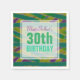 Beautiful abstract background (aqua, blue, purple and green colours) with a half-transparent white square tag (tiny transparent border) for name, date and birthday. All is customisable for this 30th birthday paper napkins.