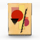 A black triangle divided into segments, a black trapezoidal band divided into two, a red circle, a yellow rectangle, a pale red square, a purplish circle, and an orange square feature in this abstract art of overlapping shapes by Richard H. Fay.