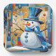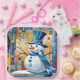 The abstract elements of the image create a whimsical and imaginative winter scene. The snowman, with its top hat and blue scarf, stands out with its colourful buttons, adding a playful touch. Spherical ornaments contribute to the festive atmosphere, while their shapes and colours blend into the background in a surreal manner.