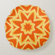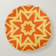 Round pillow in a geometric abstract star pattern In candle flame colours of soft orange and mustard gold, accented with white