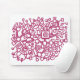 A mouse pad with an quirky hand drawn abstract surreal design, a network of shapes link together with wire like shapes which looks both natural and machine like.