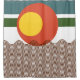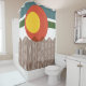 This shower curtain has a mid-century modern design of horizontal wavy lines with two circles and two horizontal broad stripes. Want different colours? Message me.