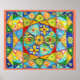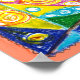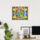 Vibrant geometric patterns fill the image, featuring circles, triangles, and swirls in a kaleidoscope of colours including blue, green, yellow, and red. The intricate design creates a sense of symmetry and balance.