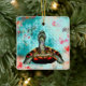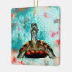 A hand drawn depiction of a turtle with an abstract background. Colours used: red, blue, teal, green, yellow, purple.