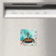 A hand drawn depiction of a turtle with an abstract background. Colours used: red, blue, teal, green, yellow, purple.