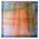 The original abstract artwork by ZoeSPEAK on this 6” Ceramic Tile suggests a view, through a window, of a landscape. The border is in shades of blue, and the interior is in shades of orange and green with pale yellow and pink highlights. There are linear bands with holes punched in them crisscrossing the design.